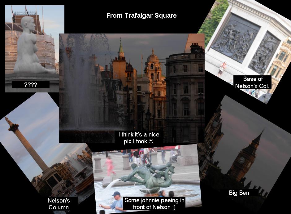 I was supposed to call Alex now, who had been waiting for me all day long. I had somehow managed to get a slip so far. But not for long. While trying to find his hotel, I passed Trafalgar square three times and saw and enjoyed almost everything that is there to be enjoyed. Its a nice place to spend an evening just chit-chatting and looking at the victorian architecture surrounding the place.